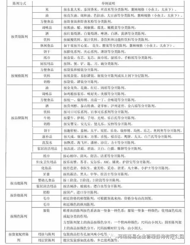 分類陳列可按類別、功能、規(guī)格、顏色、品牌、價(jià)格等分開陳列,具體見附表。